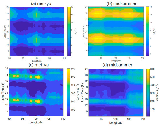 To investigate the factors influencing the precipitation, the diurnal cycle of CAPE is shown in Figure 8c,d. During the mei-yu period, CAPE shows no propagation over the TP and SB (Figure 8c). The diurnal maximum CAPE occurs in the late afternoon (1500–1900 LT) and early evening (1900–2100 LT) over the TP and SB during the mei-yu period, and the diurnal minimum occurs in the morning (0600–1000 LT). The CAPE over the TP is larger than that over the SB (Figure 8c), which is different from the precipitation and cloud LWC. During the midsummer period, CAPE shows no diurnal propagation over the TP and SB (Figure 8d). The diurnal maximum and minimum CAPE values during the mei-yu period are similar to those during the midsummer period. CAPE is related to the maximum potential vertical velocity of air within an updraft, so higher values of CAPE are an indicator of precipitation.