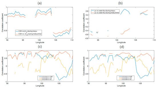 Correlation between (a) dewpoint spread and CBH and (b) water vapor flux and ΔV during the mei-yu (blue line) and midsummer (red line) periods. (c,d) Correlation of ΔV, CAPE, cloud LWC and IWC with precipitation rate during the (c) mei-yu and (d) midsummer periods.