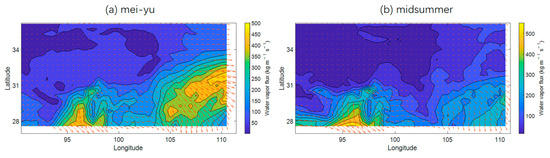 From the spatial distribution of the water vapor flux, the transportation of water vapor can be seen to be mainly from the west (Figure 10), which is similar to the results of [45]. The water vapor flux decreases from the mei-yu period to the midsummer period, especially over the SB. This is related to the decreases in the mean zonal wind profile and low-level winds from the mei-yu to midsummer period.