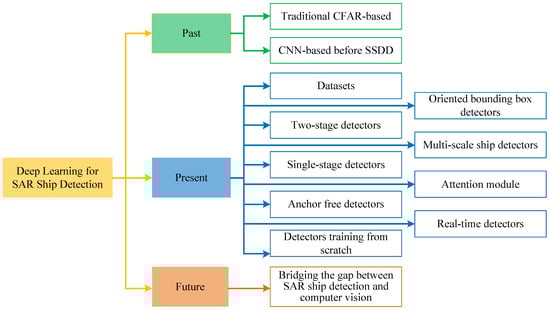 The rest of this review is arranged as shown in Figure 1. Section 2 briefly analyzes some work related to our paper. Section 3 summarizes the past of the traditional detection algorithms in SAR images. It mainly includes CFAR, hand-crafted features, and limited shallow representation. Section 4 introduces the present in deep learning-based detectors. We review the 177 papers, divide them into 10 categories and analyze them, respectively. Section 5 shows the future direction of this field. Section 6 is the conclusion of the paper.