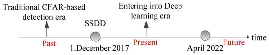 Due to the important role of SSDD, we take the publication date of SSDD paper as the time separation point between the traditional and deep learning-based detection algorithms. Therefore, we believe that ship detection in SAR images entered the era of deep learning on 1 December 2017, as shown in Figure 3. A large number of researchers gradually began to abandon the traditional detection algorithm based on CFAR and adopt the advanced detection method based on deep learning [6,7,8,9,10,11,12,13,14,15,16,17,18,19,20,21,22,23,24,25,26,27,28,29,30,31,32,33,34,35,36,37,38,39,40,41,42,43,44,45,46,47,48,49,50,51,52,53,54,55,56,57,58,59,60,61,62,63,64,65,66,67,68,69,70,71,72,73,74,75,76,77,78,79,80,81,82,83,84,85,86,87,88,89,90,91,92,93,94,95,96,97,98,99,100,101,102,103,104,105,106,107,108,109,110,111,112,113,114,115,116,117,118,119,120,121,122,123,124,125,126,127,128,129,130,131,132,133,134,135,136,137,138,139,140,141,142,143,144,145,146,147,148,149,150,151,152,153,154,155,156,157,158,159,160,161,162,163,164,165,166,167,168,169,170,171,172,173,174,175,176,177,178,179,180,181,182]. The overview of these deep learning-based detectors in SAR images is the focus of this paper.