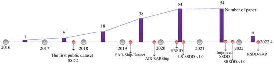 Gray lines and gray circles in the figure represent the time, the purple bar represents the number of papers in the current year, and the red circles represent the public time of the dataset. From the timeline, we can find that in the passing five years, the number of papers about deep learning-based SAR ship detectors becoming more and more. The period 2016–2017 is in the transitional period between traditional and deep learning methods, and there are sporadic papers. Additionally, due to the lack of a unified dataset and the lack of in-depth understanding of deep learning and computer vision algorithms, the application of deep learning algorithms is not thorough. This situation did not change until the emergence of the first dataset (SSDD) paper at the end of 2017. SSDD discloses the data and evaluation criteria it used, which lays the foundation for the rapid development of this field. Since then, the fast lane of research was opened, and a large number of papers were published. The milestones of this field are the several open-access datasets, which are shown in the red circle above. With the increase in available datasets, more and more researchers are paying attention to this field.