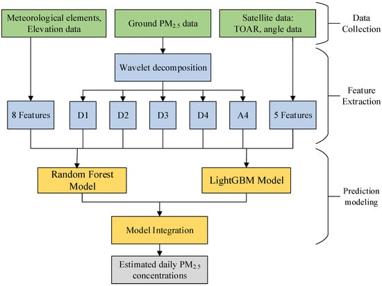 The model input features included near-ground PM2.5 data, satellite data, meteorological elements, and elevation data, where wavelet decomposition was used to decompose the PM2.5 data to obtain high frequency and low frequency components.