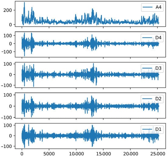 Figure 3 is a schematic diagram of the results after the wavelet decomposition of the partial PM2.5 data, with the number of samples on the horizontal axis and the PM2.5 concentration values on the vertical axis. It can be seen that the A4 low-frequency series had a clear trend as well as a certain periodicity, while D1–4 reflected the random fluctuation changes in the trend of the original series.