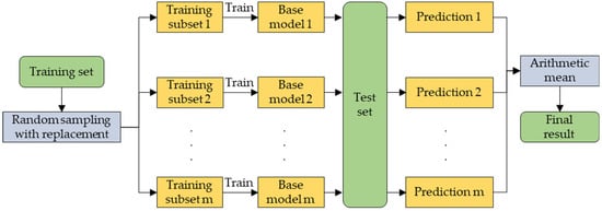 (1) Random forest model: random forest [] builds bagging integration based on decision trees as the base learner and introduces random feature selection in the training process of decision trees. The bagging algorithm randomly samples the samples with replacement, constructs mutually independent sample datasets with equal sample sizes, and trains different models in the same algorithm. For regression problems, it calculates the arithmetic average of the prediction results of all models to obtain the final result. The flowchart of the bagging algorithm is shown in Figure 4.