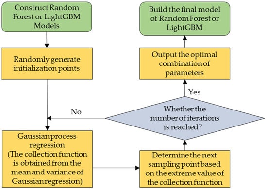 In Random Forest and LightGBM, different combinations of hyperparameters lead to models with large gaps in prediction performance, and since both models have more hyperparameters, it is necessary to automatically search for the combination of hyperparameters with the best performance. In this study, the Bayesian optimization method [] was selected to optimize the main hyperparameters of the random forest and LightGBM models. The flowchart of the Bayesian optimization algorithm is shown in Figure 5.