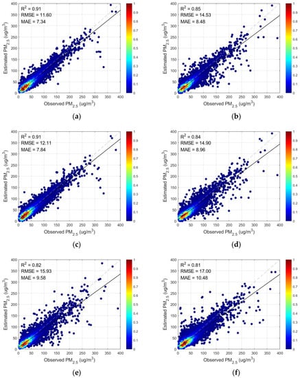 At the same time, this study also had certain limitations: (a) the research used the data of state-controlled sites, which are mainly distributed in the central areas of the city or in the more polluted areas; so, the model validation was also based on city center sites. In future research, the provincial-controlled sites and national-controlled sites will be used as research data to improve the regional representativeness of the sample and the generalization ability of the model; (b) PM2.5 concentrations are affected by many factors, such as population density, traffic flow, and Normalized Difference Vegetation Index (NDVI), etc.; these influencing factors were lacking in this study. In future research on PM2.5 concentration estimation, data from more sources will be collected, and various factors will be comprehensively considered.