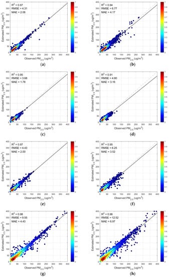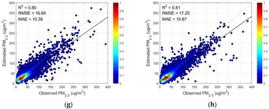 Compared with statistical models, machine learning models, including random forest, gradient boosting, and deep learning [], can better handle nonlinear problems, which can provide a more accurate estimation of PM2.5 concentrations. Li et al. [] combined random forest with AOD to monitor PM2.5 concentrations in the Beijing–Tianjin–Hebei region, which was advantageous in dealing with the complex nonlinear relationships between a large number of meteorological elements and atmospheric pollutants. Wei et al. [] proposed a tree-based spatial–temporal lightweight gradient boosting model with the inclusion of parameters such as meteorological elements, population density, land utilization, and ground elevation for national hourly PM2.5 concentration prediction. The prediction results achieved an R2 of 0.85 and an RMSE and MAE of 13.62 and 8.49, respectively, and the proposed method outperformed most traditional statistical regression models and tree-based machine learning models.