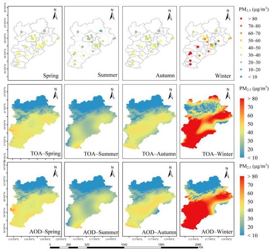 From Figure 7, it can be seen that the PM2.5 concentrations in the Beijing–Tianjin–Hebei region had obvious seasonal differences, with the highest concentration in winter, which was significantly higher than the other three seasons, with the lowest concentration in summer. The reasons for this include the rapid growth in pollutants in winter due to the use of heating, which leads to the burning of coal. Meanwhile, the model had comparable effects using TOAR and AOD in spring, summer, and autumn, but the prediction model using AOD had larger errors in winter, which is due to the seasonal limitation of the inversion method of AOD, especially in winter. As can be seen from Figure 8, the R2, RMSE, and MAE using TOAR were better than the model using AOD under the same conditions. This is due to two main problems with MODIS-based AOD products at present: first, as a sensor on a polar-orbiting satellite, AOD monitoring information can only be obtained twice a day; second, because the inversion of AOD is affected by seasons and regions. Statistics show that the annual average coverage of AOD in the Yangtze River Delta region of China was only 40% in 2013–2014 and only 25% in summer, due to the influence of cloud cover and snow accumulation []. In contrast, TOAR from satellites was used in this study for PM2.5 concentration estimation directly, which effectively avoided the intermediate process of AOD inversion, and the temporal resolution of TOAR is hourly. Therefore, TOAR has a wider spatial coverage compared with AOD, and in the areas where AOD is missing, TOAR can be used to better predict PM2.5 concentrations and provide more reliable prediction results.