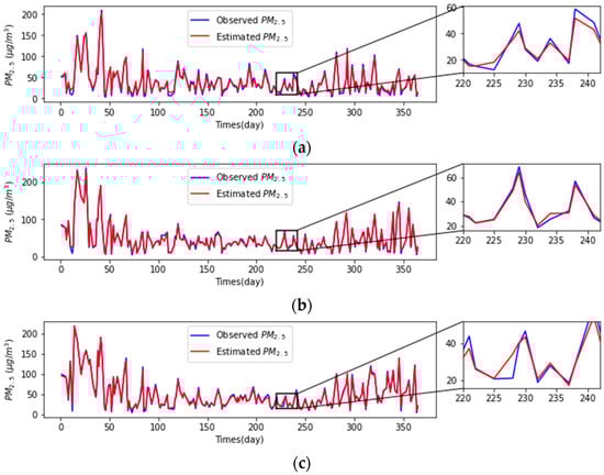 Time series of observed (blue) and estimated (red) daily PM2.5 concentrations in 2020. (a) Beijing, (b) Tianjin, and (c) Shijiazhuang.