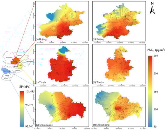 Pollution in Beijing (12 February 2020), Tianjin (27 January 2020), and Shijiazhuang (15 January 2020). (a,c,e) Depict the boundary layer height and surface pressure in the three regions. The black curve represents the boundary layer height contour (unit: m), and the background represents the surface pressure. (b,d,f) Depict the temperature and PM2.5 concentrations estimated by the hybrid model for the three regions, with the black curves representing the temperature contours (unit: K), and the background represents the PM2.5 concentrations.