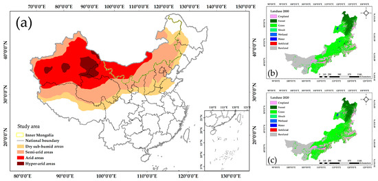 Study area. (a) Inner Mongolia study area (yellow outline) with shading to reflect the location of Inner Mongolia; (b) the land use of Inner Mongolia in 2000; (c) the land use of Inner Mongolia in 2020.