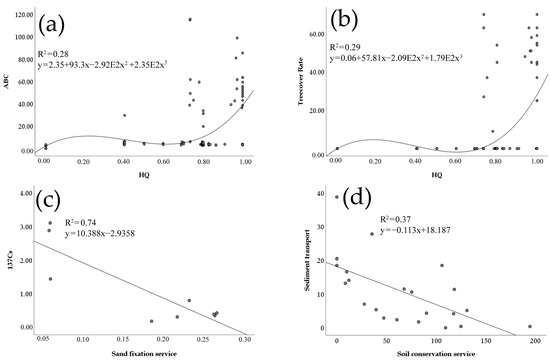 Validation of (a,b) the InVEST model (habitat quality), (c) the RWEQ model (sand fixation service), (d) the RUSLE models (soil conservation service); habitat quality (HQ), above-ground biomass carbon (ABC), Cesium (Cs), Revised Universal Soil Loss Equation (RUSLE), Revised Wind Erosion Equation (RWEQ), Integrated Valuation of Ecosystem Services and Trade-offs (InVEST).