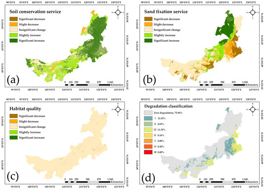 The results show that the soil conservation service in northeastern and southwestern Inner Mongolia had a sporadic degradation trend from 2000 to 2020 (Figure 4a). The sand fixation service in eastern Inner Mongolia had a significant degradation trend from 2000 to 2020 (Figure 4b). Habitat quality in Inner Mongolia had an overall stable trend from 2000 to 2020 (Figure 4c).