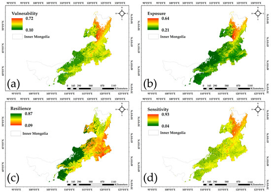 (a) Ecosystem vulnerability pattern; (b) ecosystem exposure pattern in Inner Mongolia; (c) ecosystem resilience pattern in Inner Mongolia; and (d) ecosystem sensitivity in Inner Mongolia. Blank areas represent no data areas. The color ramp of Figure 5a,b,d from red to green indicate stronger to smaller. The color ramp of Figure 5c from green to red indicate stronger to smaller.