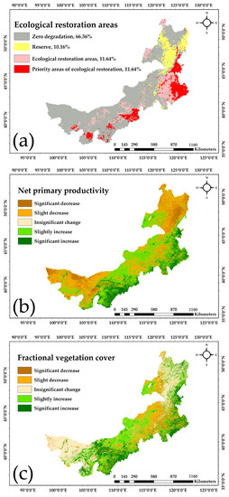 (a) Key ecological restoration areas in Inner Mongolia; (b) net primary productivity (NPP) change; and (c) fractional vegetation cover (FVC) change.