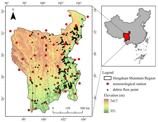 Map of the Hengduan Mountain region (HMR) showing the distribution of the debris flow points and meteorological stations in the period 2000–2020.