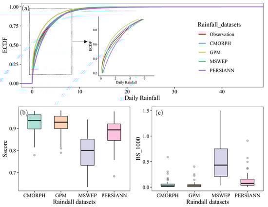Comparison of rainfall datasets on probability density. (a) Empirical cumulative distribution function (ECDF) curves for different rainfall datasets, (b,c) boxplots of the Sscore and BS of the four satellite rainfall products, respectively. BS_1000 is BS ().
