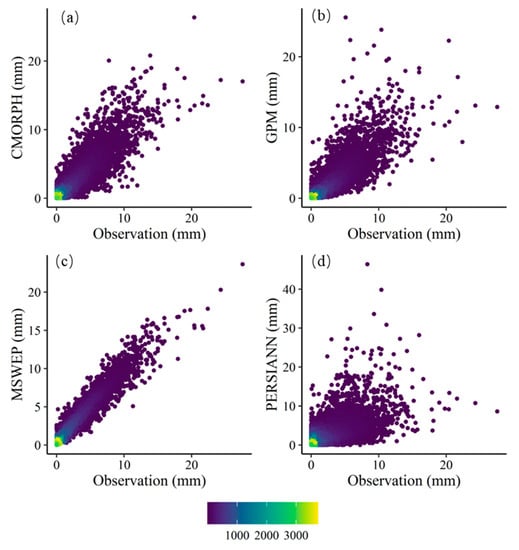 Scatter density map of the observations and daily data of (a) CMORPH, (b) GPM, (c) MSWEP and (d) PERSIANN datasets.