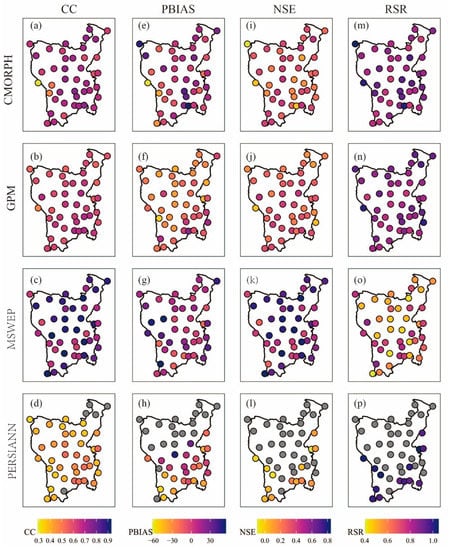 Spatial distribution of CC (a–d), PBIAS (e–h), NSE (i–l), and RSR (m–p) for four satellite rainfall products over HMR. Gray dots indicate that the value is outside the indicated range.