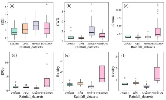 Boxplots showing the RSR values of the four satellite rainfall products at (a) SDII, (b) CWD, (c) R25mm, (d) R95p, (e) Rx1day, and (f) Rx5day.