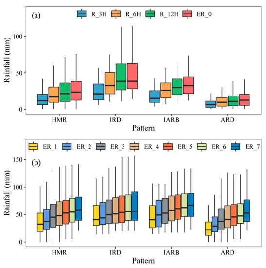 Figure 7 shows the empirical cumulative distribution function curves for HMR under different rainfall patterns. Overall, the intraday rainfall, the maximum 3-h rainfall, the maximum 6-h rainfall, and the maximum 12-h rainfall of the intraday of the low warning level (cumulative probability of 50%) are 23.5 mm, 11.7 mm, 16.9 mm, and 21.3 mm, respectively. The cumulative 7-day effective rainfall at the low warning level was 58.4 mm. The critical rainfall conditions increased with the warning level. The critical daily rainfall for medium (cumulative probability of 75%) and high warning levels (cumulative probability of 90%) were 38.2 mm and 56.7 mm, respectively. The critical cumulative 7-day effective rainfall for medium and high warning levels were 81.7 mm and 105.8 mm, respectively. From the perspective of different rainfall patterns, under the same warning level, the IRD pattern had the highest critical intraday rainfall conditions, followed by the IARB pattern, and the ARD pattern was the smallest. The critical daily rainfall values of low, medium, and high warning levels in the IRD pattern are 38.4 mm, 62.6 mm, and 75.8 mm, respectively, and the corresponding values in the IARB pattern are 32.5 mm, 44.6 mm, and 56.7 mm, respectively. The critical daily rainfall values for low, medium, and high warning levels in the ARD pattern were 12.5 mm, 20.4 mm, and 30.5 mm, respectively. However, there are differences in the order of the antecedent cumulative rainfall conditions for different rainfall patterns under different warning levels. Under the low warning condition, the critical cumulative 7-day effective rainfall of the IARB pattern was the highest at 66.7 mm, followed by the IRD pattern (55.9 mm) and the ARD pattern (52.5 mm) with the smallest values. Under the medium warning level, the critical cumulative 7-day rainfall of the IRD pattern was the highest, followed by that of the IARB pattern, and the lowest in the ARD pattern. The critical values are 90.8 mm, 88.1 mm, and 76.5 mm. The critical cumulative 7-day effective rainfall corresponding to the high warning level of the IRD pattern was the highest, followed by the corresponding value of the IARB pattern, and the corresponding value of the ARD pattern was the smallest. The corresponding critical values are 90.8 mm and 88.1 mm. mm, and 76.5 mm.