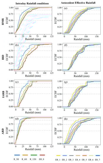 ECDF curves of intraday rainfall conditions (a–d) and cumulative 7-day effective rainfall conditions (e–h).