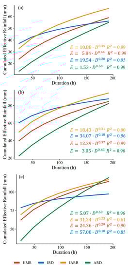 Based on the above results, it can be observed that under different warning levels, there are differences in the antecedent rainfall conditions of different rainfall patterns that trigger debris flows. Therefore, it is necessary to analyze the relationship between the cumulative effective rainfall and rainfall duration for different rainfall patterns. The E-D rainfall thresholds of debris flow in the HMR under different early warning levels were analyzed according to the intraday rainfall and the cumulative effective rainfall on days 1–7 in Figure 7. Figure 8a–c shows the E-D rainfall threshold curves for the HMR and different rainfall patterns under low, medium, and high warning levels, respectively. The results show that the value of the E-D rainfall threshold in the HMR is between 5.84 and 24.36, and the value between 0.44 and 0.29. As the warning level increases, the values of all E-D rainfall threshold curves show an increasing trend, whereas the values show the opposite trend. This shows that, with an increase in the warning level, the effect of short-term rainfall on debris flow is more obvious during the effective rainfall period. Among the different rainfall patterns, the value of the E-D rainfall threshold curve of the IRD pattern was the highest, ranging from 19.54 to 57, followed by the corresponding values of the IARB pattern, ranging from 10.88 to 31.24, and the corresponding value of the IAD pattern was the smallest, ranging from 1.53 to 5.07. The result of the value is the opposite of that of the value. The value of the ARD pattern was the largest with a value from 0.68 to 0.6, the corresponding value of the IARB pattern was the second, between 0.35 and 0.25, and the corresponding value of the IRD pattern was the smallest, ranging from 0.2 to 0.1. The difference in the initial threshold values between the different rainfall patterns was obvious. With an increase in rainfall duration, the difference in the rainfall threshold curves gradually decreased. The initial rainfall threshold was much higher than the difference at the end, which also illustrates the consistency of the antecedent effective accumulated rainfall leading to debris flow.