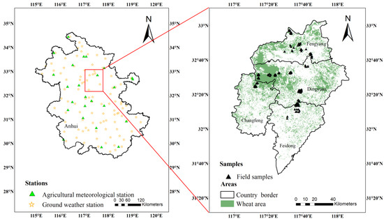 The study area addressed in this paper is located in Changfeng county, Dingyuan county, Fengyuang county, and Feidong county (29°24′N~34°39′N, 114°53′E~119°39′E), Anhui Province (Figure 1). The area is located in the lower reaches of the Yangtze River. The planting area of winter wheat is approximately 2450 square kilometres, accounting for 30% of the total area. The wheat seeding time in Anhui, including our study area, was in October 2020. The main wheat variety here is Yangmai 25, which is susceptible to FHB. The region has a subtropical humid continental monsoon climate, with an annual precipitation of approximately 1000 mm and an average annual temperature of 15 °C [24,25]. Due to the influence of monsoons, the amount of precipitation is highest in spring and summer. In addition, due to the high planting density of wheat, wheat varieties susceptible to FHB, sufficient bacterial sources, suitable precipitation and temperature, and other conditions, the occurrence of winter wheat FHB is frequent in this area [26].