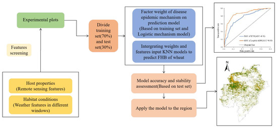 In this study, a remote sensing-based prediction method for wheat FHB was established. The mechanism of disease occurrence and development plays a key role in the prediction of wheat FHB. By inputting disease prediction factors that integrate host and habitat conditions into the logistic mechanism-based model, the factor weights of disease occurrence and development mechanism in the disease prediction model were quantitatively expressed. The disease prediction factors joined with factor weights, which were input into the KNN model to predict the incidence of wheat FHB in the study area. The results show that the logistic-KNN model can improve the prediction accuracy and stability of machine learning models.