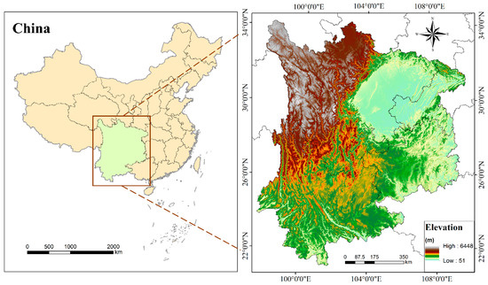 Four provinces in Southwest China were studied, namely, Sichuan, Chongqing, Guizhou, and Yunnan, ranging from roughly 21° to 35°N (see Figure 1). The landscape of Southwest China is dominated by mountains and hills, making the local topography complex and diverse. This area is influenced by the East Asian monsoon and the South Asian tropical monsoon, resulting in a wide variety of climates and high diversity of vegetation types and ecosystems. Southwest China is rich in natural resources and is an important part of China’s ecological security because of its high biodiversity and density of nature reserves, giving it the strategic function of providing ESs for all of China. Southwestern China contains the Karst Mountain range, one of the largest mountain regions in the world, which is covered with exposed carbonate rocks. This is the distribution area of important ecological restoration projects by the Chinese government, such as returning farmland to forest and grass, and natural forest protection.