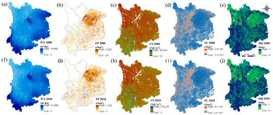 Spatial distribution of five ecosystem services in 2000 and 2018. WY: Water Yield; FP: Food Production; CS: Carbon Sequestration; SC: Soil Conservation; HQ: Habitat Quality. WY 2000 is the water yield in 2000. WY 2018 is the water yield in 2018. Same for the rest.