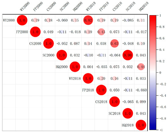 Correlations between category five ecosystem services in 2000 and 2018. WY2000: Water Yield in year 2000; WY2018: Water Yield in year 2018. Same for the rest.