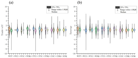 Figure 7 shows the distribution of ES change data in a reciprocal trade-off/synergistic relationship with the data normalized in advance. Each violin plot represents the data distribution; most data distributions are relatively concentrated, with discrete values for some FP and CS. Similar to the kernel density plot readings, the peak heights represent the probability density of the data, with higher peaks being denser. In Figure 7a, taking WY in WYFP as an example, it is obvious that the first orange box is wider at y > 0 than at y < 0, i.e., it indicates that most of the WY data are positive when WY presents a trade-off with FP. Another example is in Figure 7a,b, where SC in WYSC shows a different form of data distribution in a trade-off or synergistic relationship with WY. When synergistic relationships are present Figure 7b, SC data are more dispersed. In Figure 7a,b, the probability density of FP in FPSC in the trade-off/synergy relationship with SC is larger for FP < 0 data under the trade-off relationship than for FP < 0 data under the synergistic relationship.