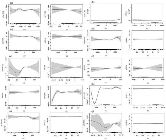 Based on the study of simple trade-off/synergistic relationships among ESs, the drivers of these relationships were further explored. Yang et al. [45] compared ESs in the lower reaches of the Pearl River at different levels of urbanization; Peng et al. [46] researched the relationship between ESs and urbanization in the mountainous regions of southwest China; Luo et al. [47] analyzed the impact of land use change on the trade-offs of ESs in the Chishui River basin; Chen et al. [48] explored the human- and climate-driven mechanisms of changes in trade-offs between ESs in the Chengdu-Chongqing urban agglomeration, and the influence of national policies; and Qiu et al. [49] analyzed the effects of topographic factors, soil texture, and human activities on trade-offs of ESs in different climatic zones in Shaanxi Province. This study used a GAM to establish a nonlinear relationship between ESTD and the changing values of each ES, based on a smooth function of each explanatory variable. By plotting response curves, we can identify the dominant services in the trade-off/synergistic relationship between ESs, which assists the macro-regulation of ESs. We found that WY dominated most of the trade-off/synergistic relationships, and the influence of FP was relatively large, with SC and HQ usually having a comparatively smaller influence. Such research provides important information for ecological conservation and restoration, thus helping understand human and natural impacts on ecosystems. For example, Figure 8a shows that the trade-off/synergy relationship between WY and FP gradually decreases from higher synergy when WY changes up to a certain level. As WY increases, the synergistic relationship changes to a trade-off relationship. Such regularity provides a quantitative reference for the agricultural rationalization of irrigation and drainage, providing inspiration for the change in trade-off/synergy between ESs.