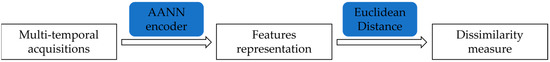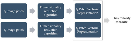 Figure 10 shows the main procedure steps for change detection at the patch level. The smaller representation, i.e., the patch vectorial representation (PVR), of the input patches associated with time t1 was obtained by means of the AANN or the DWT techniques. In particular, only the encoder stage of the AANN is involved in this step, with the output represented by the bottleneck layer. Thus, the AANN input is a vector of length 1024, which is compressed into a smaller vector of length 32. Afterwards, the same procedure was done for the patch associated with time t2. Then, the dissimilarity between the two obtained PVRs was computed.