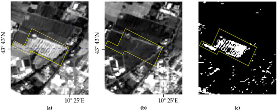 Example of an area used for the threshold determination: (a) the average value of the changed pixels in the yellow polygon is 1700 at time t1 and (b) 740 at time t2. (c) Binary image obtained with 1000 as threshold value (changed areas are shown in white).