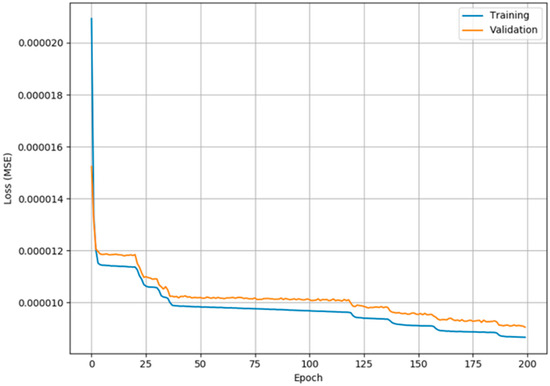 The final AANN architecture resulted in the following topology: 1024 units in the input and output layers, 128 units in the encoded and decoded layer and 32 units in the bottleneck layer. The number of 128 units stems from a trial-and-error approach in which it was observed that other lengths of these intermediate layers did not improve the final performance. The model was developed in Python with TensorFlow2 and Keras libraries and trained with the mean squared error (MSE) loss function and Adam optimizer [36]; the batch size was set to 64. A backpropagation algorithm was applied for the weights matrix update [37]. Figure 7 shows the trend of the loss function for the training and validation sets.