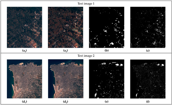 In Figure 11, two images extracted from the test set are shown. Figure 11a1,a2 represent an area mainly covered by vegetation. The main changed elements regard the land cover with some variations in buildings and roads. The ground truth is represented at two levels: in Figure 11b, it relies on the OSCD dataset, while, in Figure 11c, it stems from the CVA technique explained in Section 2.2. In both cases, the changed areas are shown in white. Similarly, Figure 11d1,d2,e,f represent another pair of images with the associated ground truth, but, in this latter case, the images show mainly built-up areas.