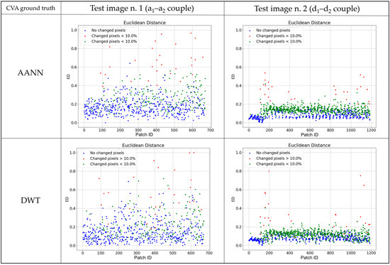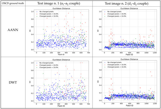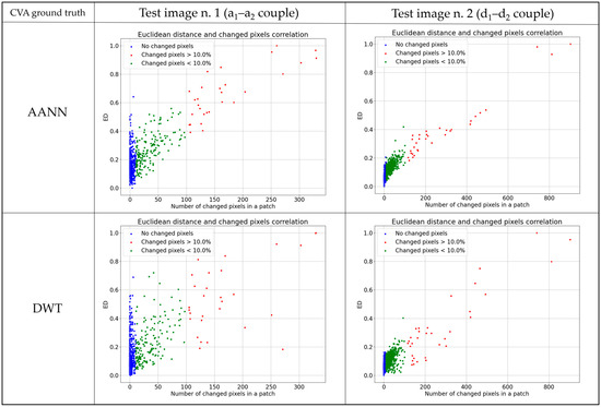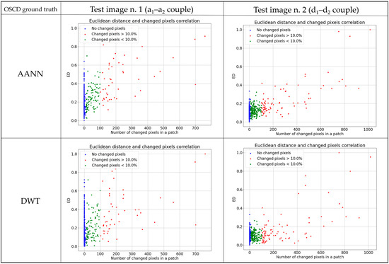 In an ideal setting, the ED values related to a no change condition should be the lowest and grow as the number of changed pixels increases. This trend is evaluated in Figure 13, which reports the correlation between the number of changed pixels in a ground truth patch and the respective ED. As for Figure 12, the graphs are shown for the AANN and DWT algorithms. Indeed, the presence of a linear correlation can be observed, especially for the AANN method. It also has to be noted that the linear trend is disturbed by the significant number of the no change patches, and this situation is enhanced in test image number 1.