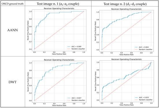 Table 2 summarizes the results obtained for test image number 1, shown in Figure 11(a1,a2), validated with the OSCD and CVA reference images. The results obtained with the AANN and DWT techniques were compared; the table also reports the AUC values. The change detection with AANN reduction performed better than DWT, as already demonstrated in Figure 12 and Figure 14. F1 achieves 0.86 with CVA validation and AANN reduction, which is more than 0.2 higher than DWT. The result also increases by the same value when validating with OSCD reference image, although, in this latter case, the best absolute value of F1 is 0.6. Recall represents an important metric to analyze, since it provides a measure of the number of missed changes, and these are the main focus of a change detection algorithm. Recall doubles by performing reduction with the AANN, with both OSCD and CVA validations.