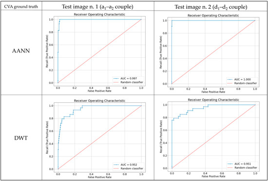 Figure 16 highlights that the lowest AUC value occurs for test image number 2, in the DWT case. With the AANN algorithm, the value improves by approximately 0.2. Test image number 1 exhibits better AUC values; the best is 0.909 for the AANN algorithm. By validating with the CVA (Figure 17), the values increase, reaching almost 1 for test image 2 with the AANN algorithm, but the other cases also reach high AUC values.