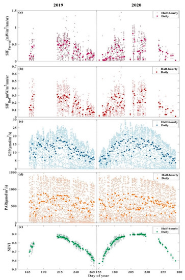 Seasonal patterns of (a) the canopy solar-induced chlorophyll fluorescence at the far-red band (), (b) the canopy solar-induced chlorophyll fluorescence at the red band (), (c) gross primary productivity (GPP), (d) photosynthetically active radiation (PAR), (e) normalized difference vegetation index (NDVI) at AR site in the growing seasons in 2019 (left) and 2020 (right). The dark large dots represent daily averaged data, and the light small dots represent half-hourly averaged data.