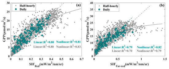 The existence of coupling between SIF and GPP has been illustrated in a variety of studies on various platforms, scales, and ecosystems, but whether the link between SIF and GPP is linear or nonlinear remains inconclusive [28,53]. Previous studies indicated that the SIF-GPP relationship is linear [26,30], but mounting studies have shown that the SIF-GPP relationship tends to be more nonlinear as the data temporal resolution improves [54,55,56]. Because of this, two fitted models, linear and nonlinear, were used to depict the SIF-GPP relationship for the 30-min averaged data, while for the daily averaged data, only the linear fitted model was used.