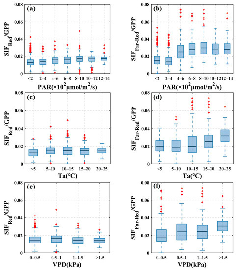 In this research, the ratio of /GPP was found more stable than /GPP as environmental factors varied at the seasonal scale. We investigated the relationship between -GPP and -GPP with seasonal changes in PAR, Ta, and VPD at seasonal scales using the ratio of SIF to GPP. As Ta, VPD levels varied along the x-axis, /GPP was able to remain relatively stable, and the boxes at different levels in Figure 4c,e were roughly on the same level, indicating that the sensitivity of and GPP to changes in Ta and VPD were similar. Therefore, the magnitude of /GPP values did not change obviously on the seasonal scale. Compared to the stability of /GPP, the value of /GPP showed a more obvious fluctuation with the variation of Ta and VPD and showed an increasing trend. Both Ta and VPD can cause physiological activity alterations in vegetation as Ta variations cause changes in photosynthetic enzyme activity, while VPD variations change the degree of opening of vegetation stomatal conductance. Red SIF is more closely correlated with changes in vegetation physiological activity and may provide more timely feedback than far-red SIF on physiological changes such as photosynthetic carbon assimilation due to environmental changes [11], and this may explain why /GPP was more stable than /GPP. As shown in Figure 4, when PAR levels varied along the x-axis, /GPP also showed slight fluctuations after PAR reached a certain level, but obviously not as much as /GPP. As discussed in Section 4.1, both the red SIF and GPP were probably saturated, but likely the degree of saturation was different for both, resulting in slight fluctuations in /GPP. While saturation occurred in GPP, the far-red SIF value was still increasing, thus leading to large fluctuations with an increasing trend in the value of /GPP. These results are consistent with the conclusions obtained in Figure 2.