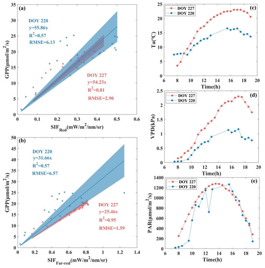 Scatter plot of the fitted relationship between (a) , (b) , and GPP at the diurnal scale and daily variations of (c) air temperature (Ta), (d) vapor pressure deficit (VPD), and (e) photosynthetically active radiation (PAR) for DOY220 and DOY227 in 2020 at AR site. The scatter points represent half-hourly averaged data, the solid line represents the fitted line of the SIF-GPP relationship, and the shaded area indicates the 95% confidence level of the prediction, where red represents DOY227, and blue represents DOY220.