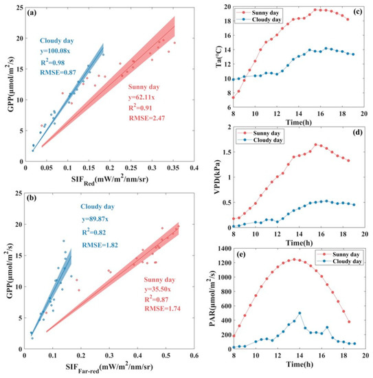 Scatter plot of the fitted relationship between (a) , (b) , and GPP at the diurnal scale and daily variations of (c) air temperature (Ta), (d) vapor pressure deficit (VPD), and (e) photosynthetically active radiation (PAR) for a typical sunny day and cloudy day at AR site. The scatter points represent half-hourly averaged data, the solid line represents the fitted line of the SIF-GPP relationship, and the shaded area indicates the 95% confidence level of the prediction, where red represents sunny day and blue represents cloudy day.