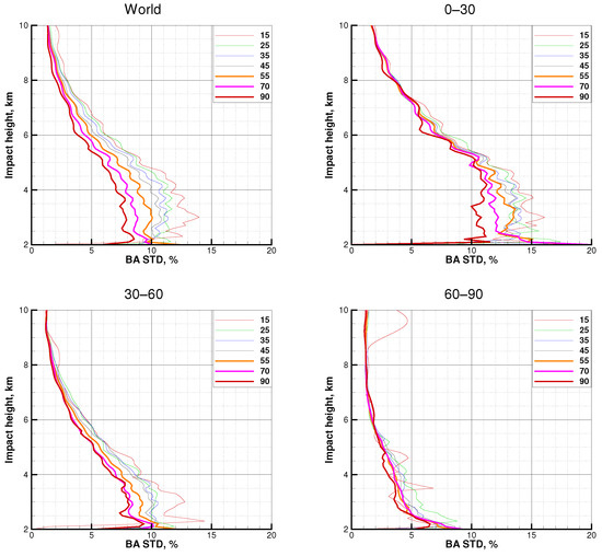 Both GO and WO processing require the numerical differentiation of the phase in the time domain or in the impact parameter domain, respectively. This requires data filtering. It must be taken into account that different missions have different sampling rates: COSMIC, Spire, METOP have 50 Hz, and COSMIC-2 has 100 Hz. Note that the original METOP data are sampled at 1000 Hz in order to provide enough data for the stripping-off of the navigation message, or demodulation, without the need for an externally-supplied navigation bit stream [15]. However, at CDAAC, the demodulated METOP data are downsampled to 50 Hz. In addition, the ray perigee movement speed depends on the occultation geometry. To have a consistent and geometry-independent definition of the filtering window, we always formulate it in kilometers. For GO processing, the filter width in kilometers is transformed to filter width in seconds using the approximate relation between the time and ray perigee height given by the climatological model . This results in a consistent filtering for GO and WO processing, providing their seamless combination at the altitude of 20 km. We apply a variable filtering algorithm, which implies that the filter width is a function of the impact height. The filtering scheme with a variable filtering width was first implemented around the year 2000 in the End-to-End GNSS Occultation Performance Simulator (EGOPS) developed by the scientific group under the leadership of Prof. Gottfried Kirchengast (currently Wegener Center for Climate and Global Change). Later (around 2010), the same feature was also implemented in the Radio Occultation Processing Package (ROPP) developed by Radio Occultation Meteorology Satellite Application Facility under EUMETSAT. Our characteristic filter width increases from 1 km at the lower border to 3 km at the height of 50 km and higher. Our experiments with filter width indicated that the change of the filter width from 1 km to 0.25 km only slightly affects STD. The reason is that the atmospheric inhomogeneities affecting RO inversions have steep spectra with a prevailing low-frequency component [43,44].