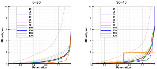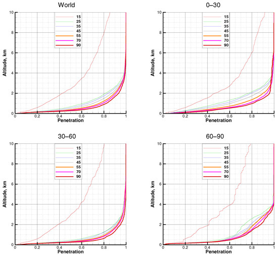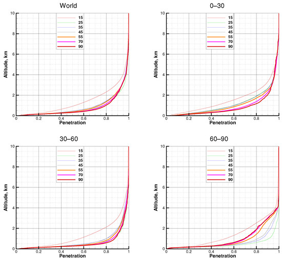 Figure 2, Figure 3 and Figure 4 show the bias, the STD, and the penetration for the COSMIC data as functions of the statically normalized SNR. The altitude is given above the Mean Sea Level (MSL), similar to [18]. Given the deviation of the bending angles for a specific mission from that evaluated for the background model, the bias is evaluated as , where the angular brackets denote the averaging of the ensemble of realizations. The STD is then evaluated as . The lowest SNR value of 15 belongs to the distribution tail, so the corresponding bias, STD, and penetration are unstable. The results indicate that the dynamically normalized SNR is a good estimator of data quality. The negative bias in the tropics and middle latitudes decreases in its absolute value with increasing SNR. The STD in these latitude bands also shows a significant decrease. In the polar latitudes, the dependence of STD on SNR is weaker.