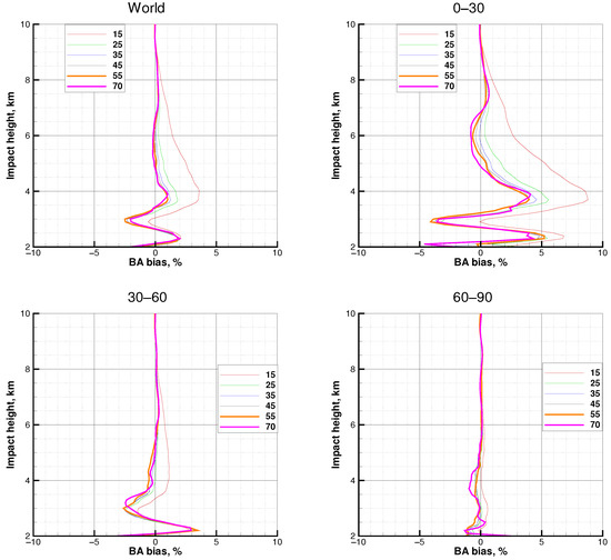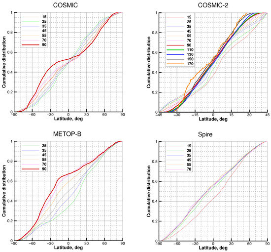 As regards the dependence of the bias on the SNR, the differences between missions are explained by the different dependence of their latitudinal distributions on the SNR, as shown in Figure 20. For Spire data, the latitudinal distribution indicates a very weak dependence on SNR, except the lowest SNR of 15. Therefore, here, we can see the best approximation to the “true” dependence of the statistics on the SNR. It indicates a tendency to saturation at some SNR level. The distribution also allows us to explain the somewhat unexpected behavior of COSMIC bias, which becomes more positive and strongly decreases by its absolute value with increasing SNR: for a higher SNR, a smaller fraction of COSMIC events falls into the central part of the tropical latitude band, where the negative bias is the biggest.